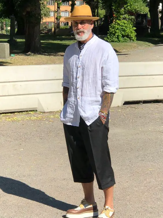 Цей образ передає сутність джентльмена, який поєднує яскравість минулої епохи з сучасним комфортом, створюючи повсякденне літнє вбрання для чоловіків старше 60 років, яке є одночасно вражаючим і гармонійним.