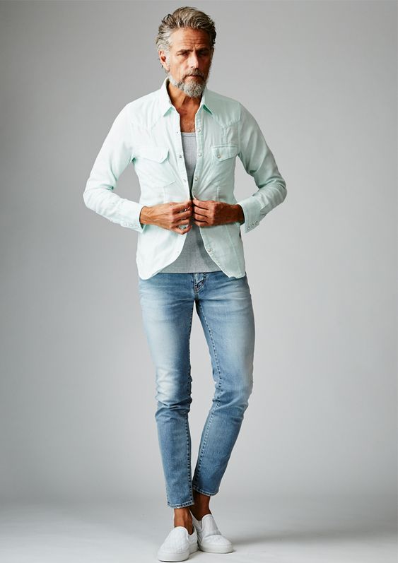 Свідоцтво позачасового стилю, цей образ поєднує в собі класичну привабливість світлого деніму з сучасністю чіткої сорочки без заправок, що втілює невимушений літній одяг для чоловіків старше 60 років.