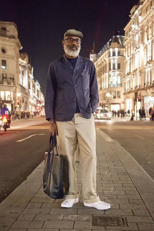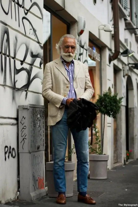 Цей джентльменський стиль привносить на вулиці нотку космополітичного шику, плавно поєднуючи повсякденні та класичні елементи для виразно міського літнього вбрання для чоловіків старше 60 років.