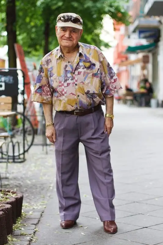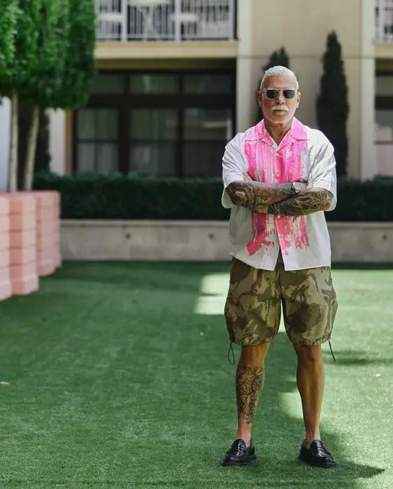 Вік – це лише цифра, а стиль не знає меж. Людина тут доводить це, створивши вражаюче молодіжне вбрання з розфарбованою сорочкою та камуфляжними шортами, що кидає виклик традиційному літньому вбранню для чоловіків старше 60 років.