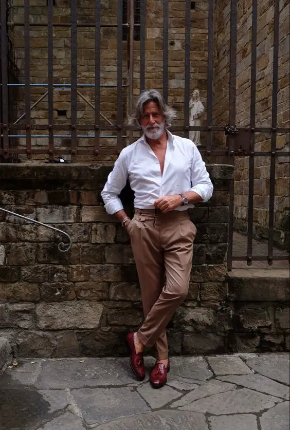 Ансамбль, зображений тут, уособлює літнє вбрання для чоловіків старше 60 років із непохитним нахилом до класичної елегантності. На тлі історичної кам’яної кладки одяг суб’єкта розповідає про історію, багату досвідом.