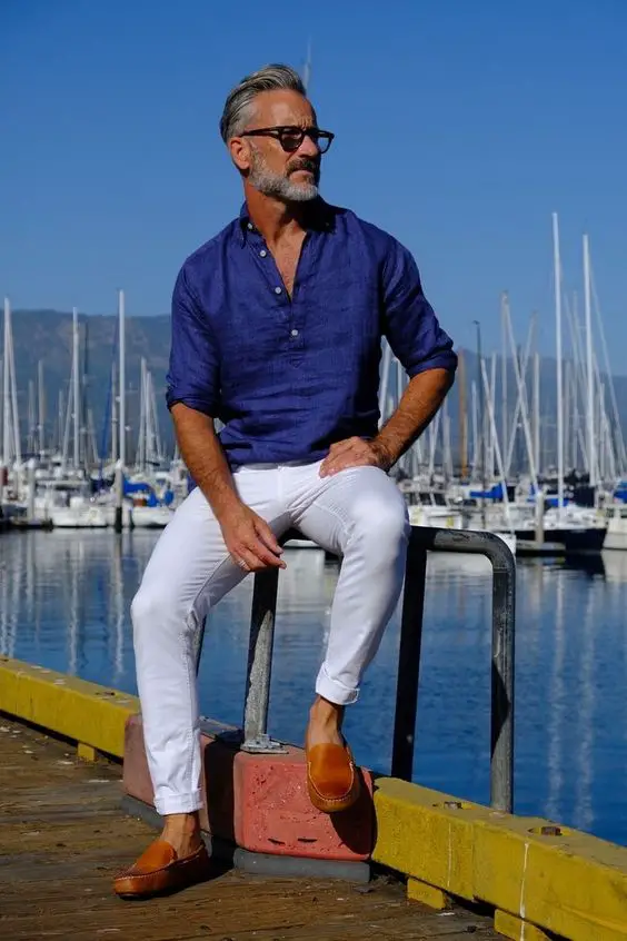 Цей образ відображає суть літнього вбрання в морському стилі, пропонуючи ідеальне поєднання стилю та комфорту для зрілого чоловіка.