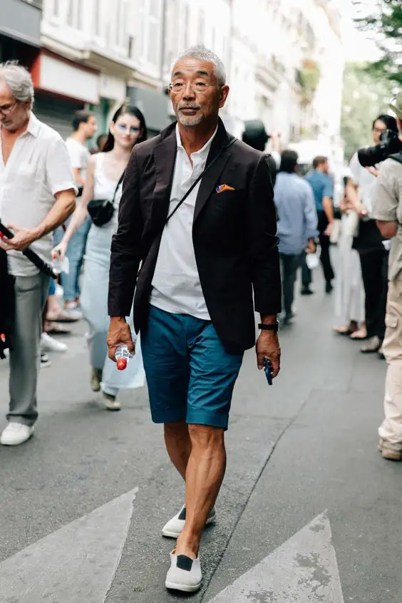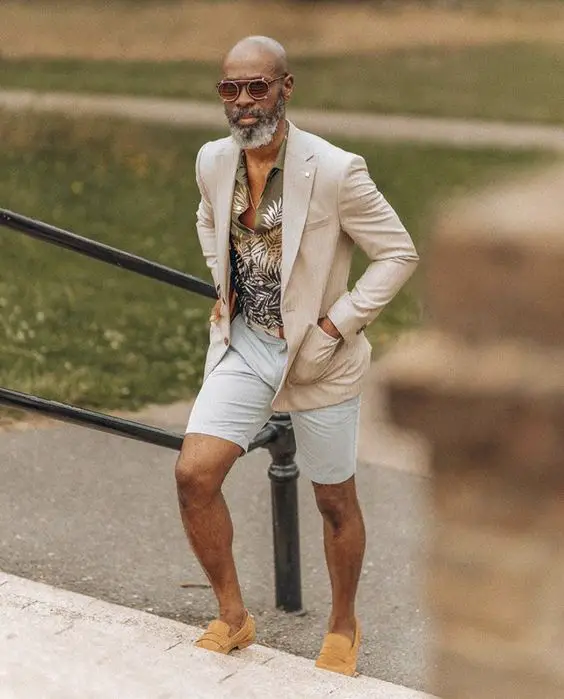Поєднуючи практичність шортів із чіткістю пошитої сорочки, цей образ є ілюстрацією того, як повсякденне літнє вбрання для чоловіків старше 60 років може бути одночасно розслабленим і витонченим.