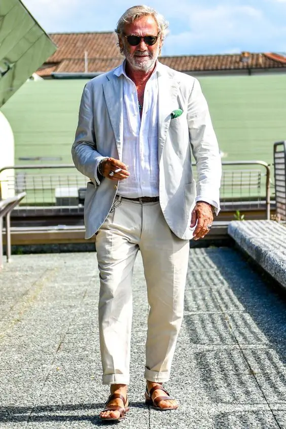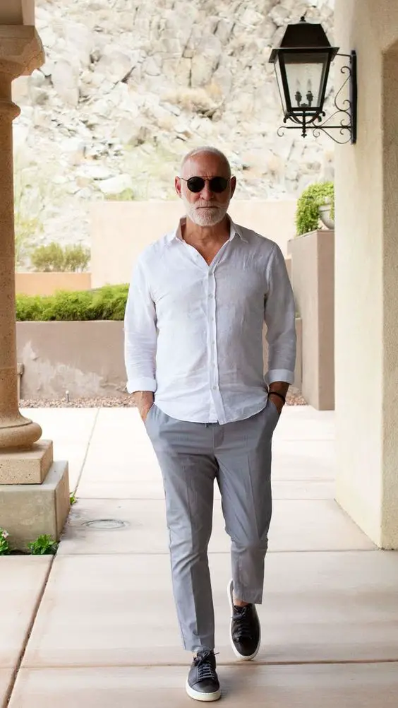 Вийти влітку не означає пожертвувати елегантністю заради комфорту. Чоловік на зображенні втілює це, одягаючи світло-сірий блейзер поверх чіткої білої сорочки, найкраще поєднання для повсякденного літнього вбрання для чоловіків старше 60 років.