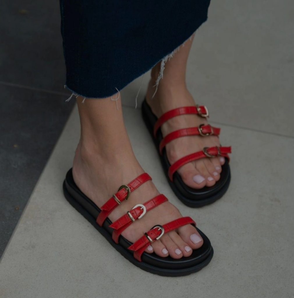 Елегантні та мінімалістичні червоні босоніжки з ремінцями обов’язкові для літнього гардеробу. Витончений дизайн із золотистими пряжками робить їх досить універсальними, щоб одягати їх як гірше, так і внизу. Такі босоніжки ідеально підійдуть для літнього вечора або повсякденної прогулянки в парку.
