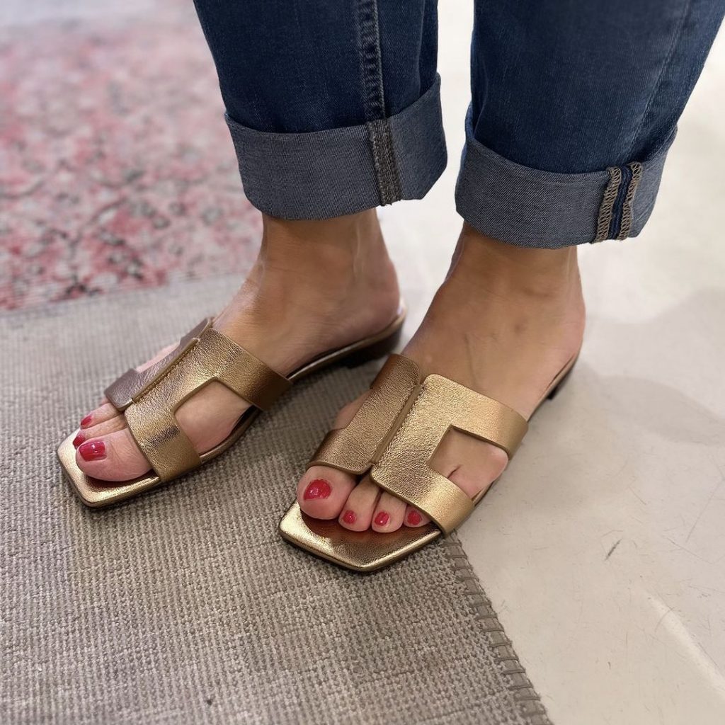 Босоніжки з металевою золотистою пряжкою привнесуть нотку розкоші в будь-який літній гардероб. Блискуче металеве покриття та елегантна пряжка роблять ці босоніжки ідеальними для додавання гламуру вашому вбранню. Ці босоніжки ідеально підходять як для денних, так і для вечірніх заходів.