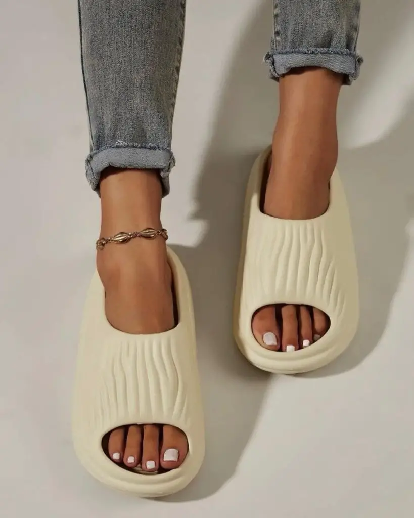 Ці кремові ребристі тапочки є втіленням мінімалістичної елегантності. Їх унікальна ребриста текстура та дизайн з відкритим носком роблять їх одночасно стильними та дихаючими, ідеальними для літнього сезону. Ці тапочки ідеально підходять для тих, хто цінує елегантний і стриманий вигляд. Нейтральний колір гарантує, що їх можна поєднувати практично з будь-яким одягом.