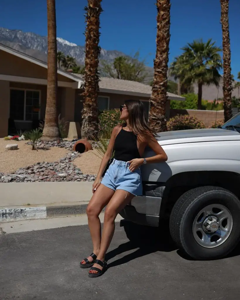 Літо дає з собою відверту свободу носити менше та виражати більше, і ніщо не говорить про літню повсякденність, як класичні літні джинсові шорти. Джинсові шорти в цьому образі є квінтесенцією літнього одягу — чіткі, з манжетами та ідеально поєднуються з простою чорною майкою. Одяг красномовно говорить про невимушений стиль, ідеальний для жінки, яка втілює впевненість і невимушений шарм.