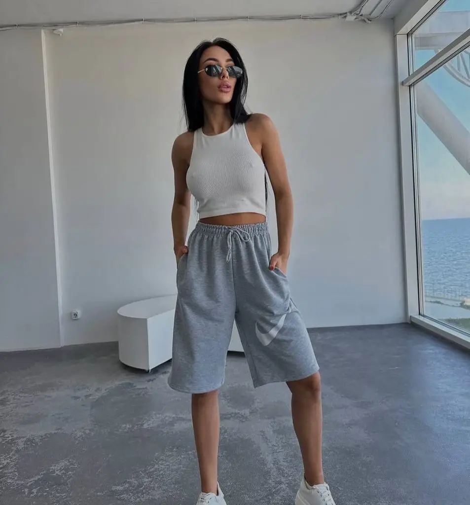 Сфера літніх шортів вітає спортивний відпочинок з розкритими обіймами, де комфорт не поступається стилю. Образ представляє бездоганне поєднання легкості та елегантності, укорочену ребристу безрукавку в поєднанні з сірими шортами вільного крою. Цей ансамбль втілює ідеї літнього короткого вбрання для активного дня або невимушеного дня в кафе.