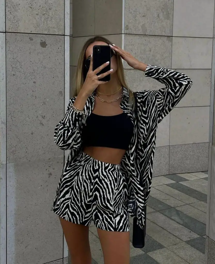 Ніщо так не говорить про безстрашну моду, як поєднання сміливих візерунків і елегантних базових речей. Тут літні шорти вирушають у дику природу з шортами в смужку зебри в поєднанні з простим чорним укороченим топом, створюючи ансамбль, який ідеально підійде для модної людини, яка готова зробити заяву на вулицях міських джунглів.