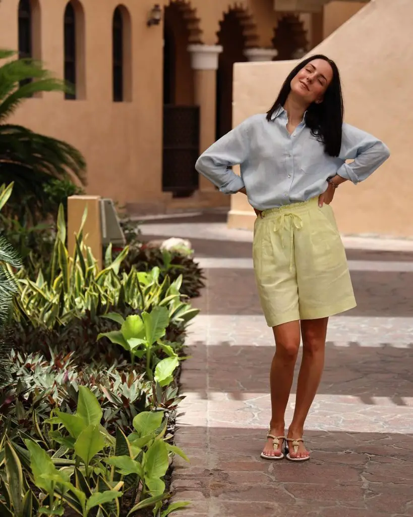 Літні шорти великого розміру не повинні уникати кольору. Образ демонструє розслаблений, але вишуканий літній образ: лляні шорти з високою талією в поєднанні з легкою сорочкою на ґудзиках ідеально підходять для літнього пікніка чи прогулянки ботанічним садом.