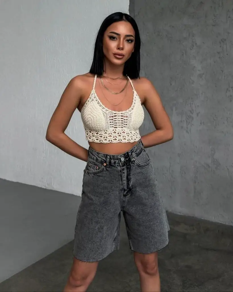 Богемний дух не відпочиває влітку, особливо з милим літнім нарядом із шортами, який додає шарму бохо. Тут витонченість в’язаного кроп-топа поєднується з урбаністичними шортами з деніму кислотного кольору, створюючи гармонійне поєднання для тих, хто любить поєднувати текстури та стилі.