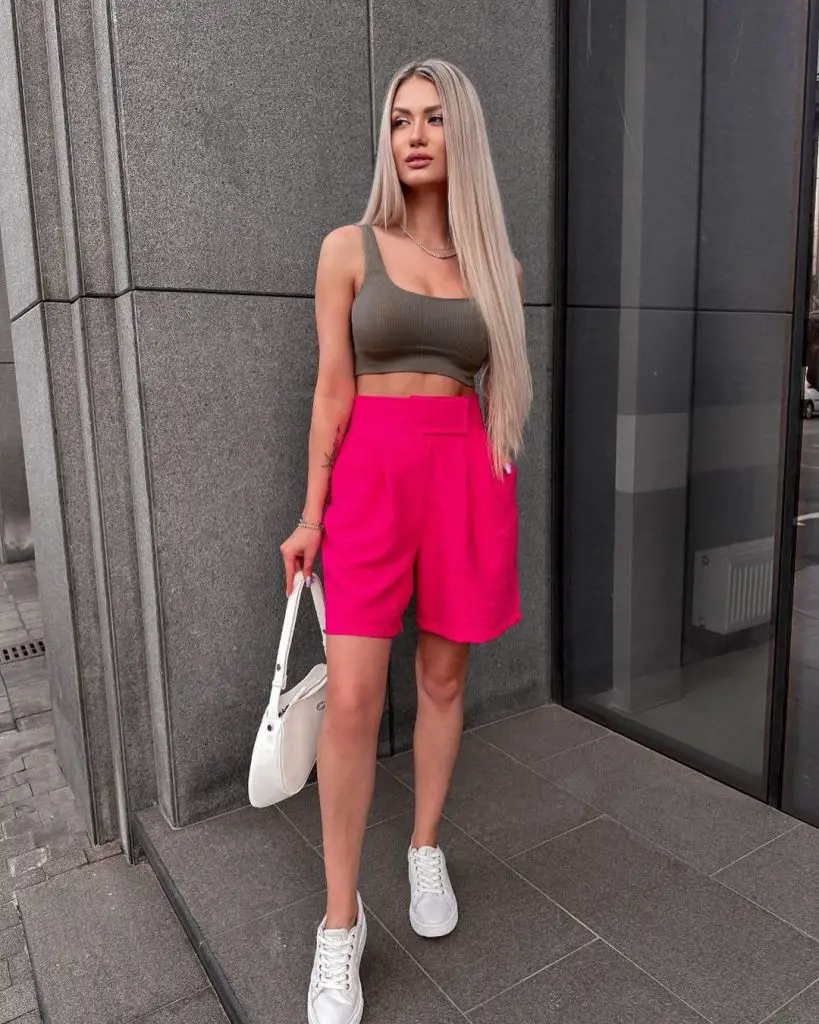 • Яскраві шорти: яскраво-рожеві, з високою талією, приталені, що втілюють літній грайливий дух.