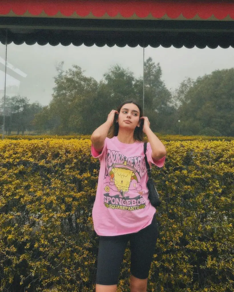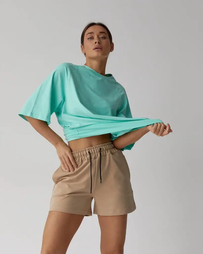 Серед різноманіття літніх шортів тенденція байкерських шорт виділяється комфортом і універсальністю. На цій фотографії грайливий образ літніх байкерських шортів, де відпочинок поєднується з характером. Велика футболка з графічним малюнком створює яскравий контраст із гладкими чорними байкерськими шортами — ідеальне поєднання комфорту та вуличного стилю.