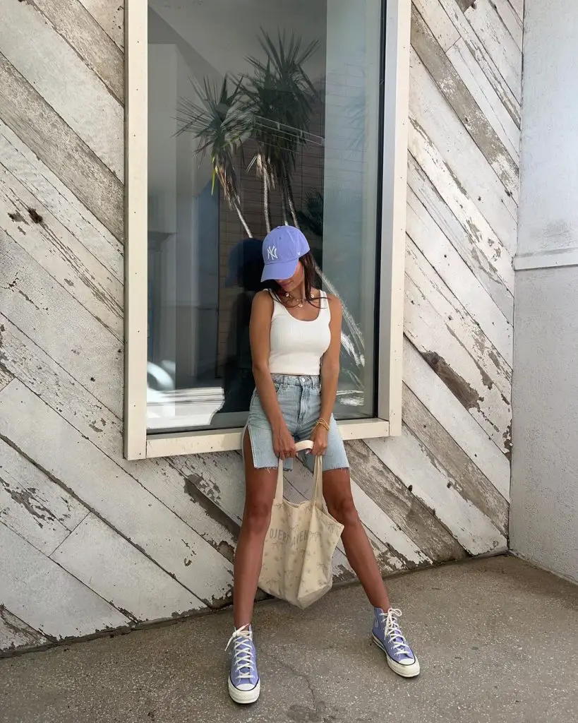 Коли температура різко підвищується, миле літнє вбрання з шортами стає непереборним вибором. Тут повсякденна чіткість білої безрукавки та потертих джинсових шортів створюють образ, який є одночасно свіжим і молодіжним. Доповнений повсякденною бейсболкою, це квінтесенція ансамблю для будь-якої літньої прогулянки.