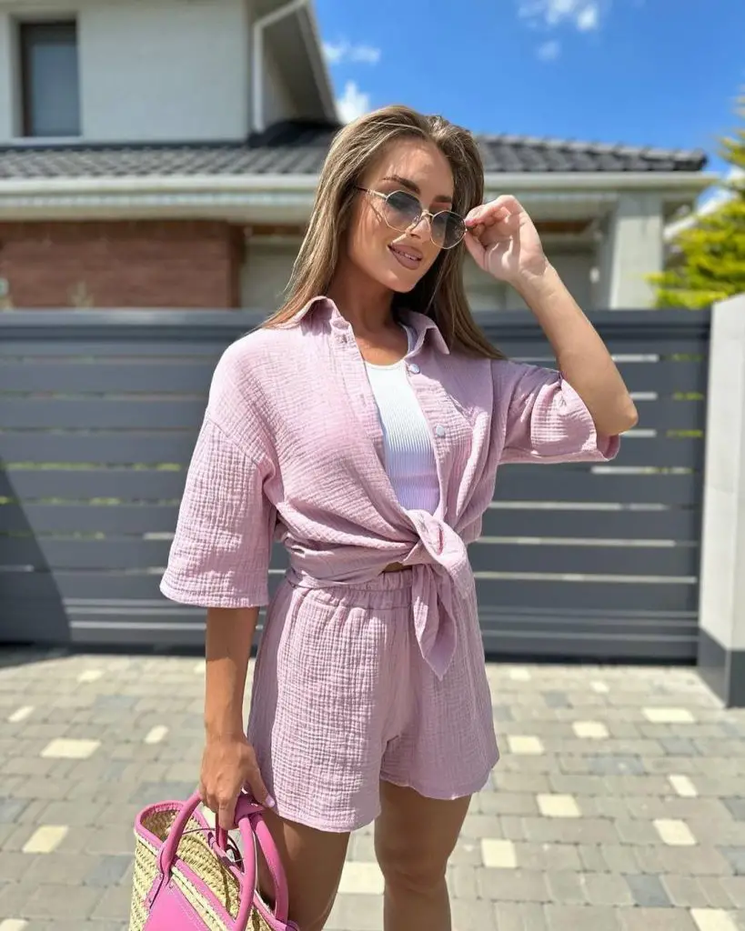 Літо — час для легких тканин, і цей милий літній наряд із шортами з локонів — це приємний настрій на сонячні дні. Сорочка із зав’язкою та відповідні шорти створюють структурований, але невимушений ансамбль, ідеальний для відпочинку на вихідних або випадкової зустрічі з друзями.