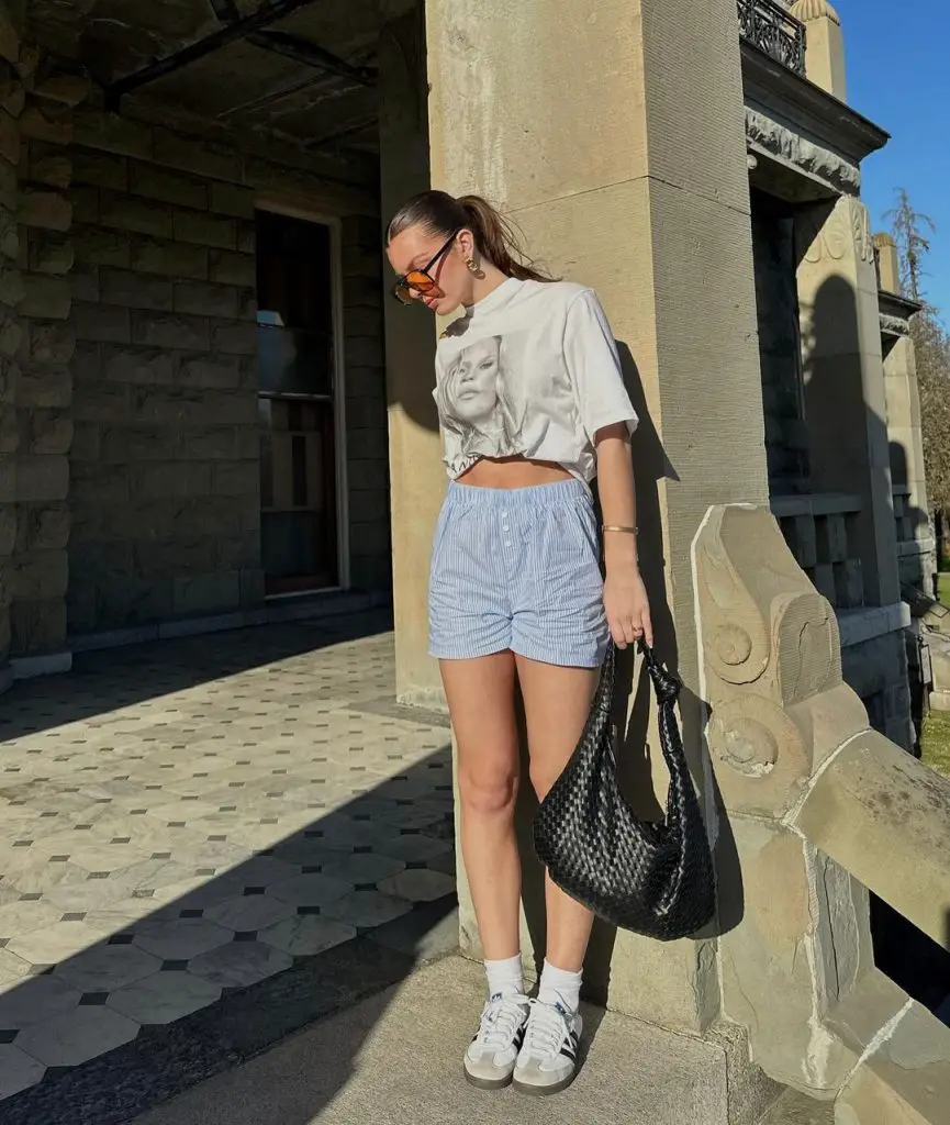 Іноді ідеї літнього короткого вбрання потрібна лише трохи химерності, щоб перейти від простого до стильного. До цього ансамблю входять класичні шорти в синю смужку та шикарна футболка з малюнком. Поєднання повсякденних шорт із міським краєм футболки створює вражаючий образ.