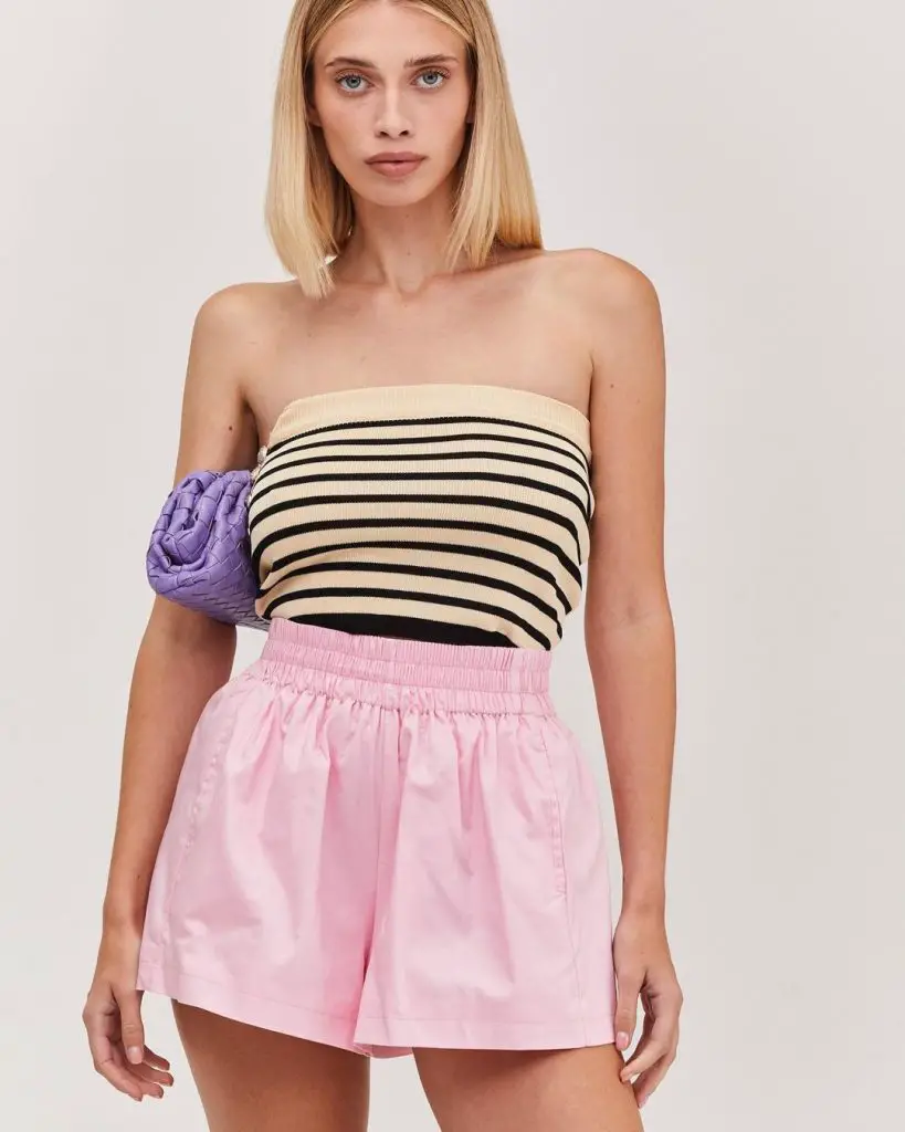 Серед жахливої ​​спеки ніщо не відчуває себе так добре, як одягнутися в стильний і прохолодний одяг. Цей ансамбль являє собою сміливе поєднання смуг і однотонних кольорів, створюючи образ, який обов’язково приверне увагу. Топ без бретелей у смужку чудово поєднується з м’якими шортами пастельних тонів, що робить його ідеальним літнім одягом для тих, хто цінує грайливу, але водночас витончену естетику.
