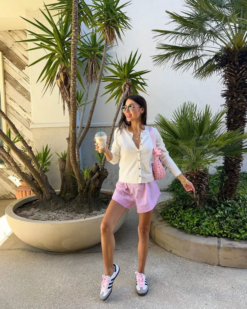 Коли літо вимагає трохи елегантності, літні шорти можуть бути на висоті. На зображенні тут пошиті рожеві шорти створюють солодку основу для багатошарового білого кардигану, створюючи вишуканий, але невимушений морський ансамбль.