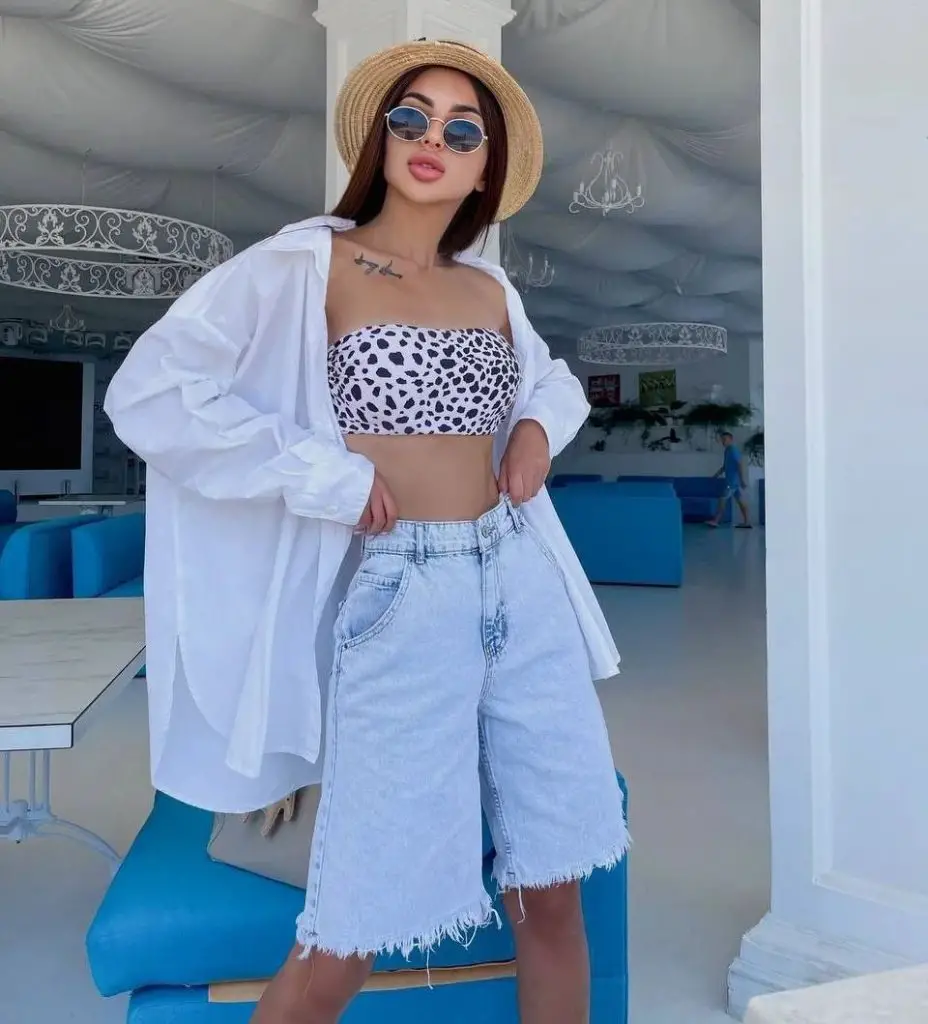 Літо не повне без дня біля моря, а літній одяг із шортами великого розміру може забезпечити стиль і комфорт. У цьому образі вільні джинсові шорти в поєднанні з грайливим топом із тваринним принтом виглядають невимушено стильно, ідеально підходять для пляжного кафе чи прогулянки вздовж пірсу.