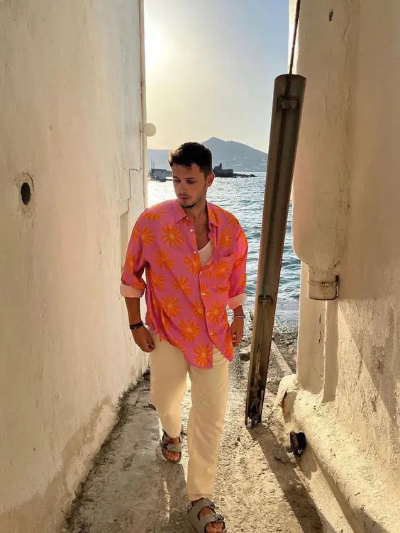 Для тих, хто любить сміливі кольори та веселі принти, цей наряд варто спробувати. Яскраво-рожева квітчаста сорочка в поєднанні з кремовими брюками створює яскравий образ, готовий до пляжного відпочинку. Ідеальний для чоловіків середньої статури, цей наряд ідеально підходить для літньої відпустки або пляжної вечірки.