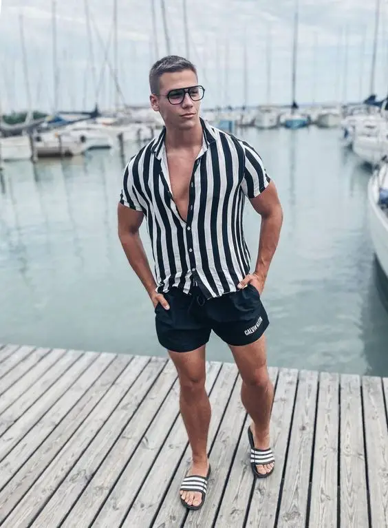 Цей одяг ідеально відображає суть повсякденного літнього чоловічого вбрання на пляжі завдяки сміливій чорно-білій смугастій сорочці в поєднанні з чорними плавальними шортами. Ідеально підходить для чоловіків спортивної статури, цей образ ідеально підходить для дня на пристані для яхт або післяобідньої прогулянки на пляжі.