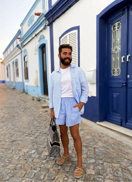 Цей ансамбль є прекрасним прикладом повсякденного літнього чоловічого стрітстайлу. Світло-блакитна смугаста сорочка та відповідні шорти створюють цілісний і стильний образ, який чудово підійде для літньої відпустки або дня, присвяченого дослідженню прибережних міст.