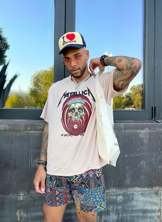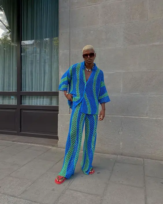 Цей одяг є сміливим варіантом повсякденного літнього вбрання чоловіків у вуличному стилі з його яскравим набором для в’язання гачком. Ідеально підходить для чоловіків, які люблять виявляти себе, цей образ ідеально підходить для фестивалів або стильних літніх вечірок.