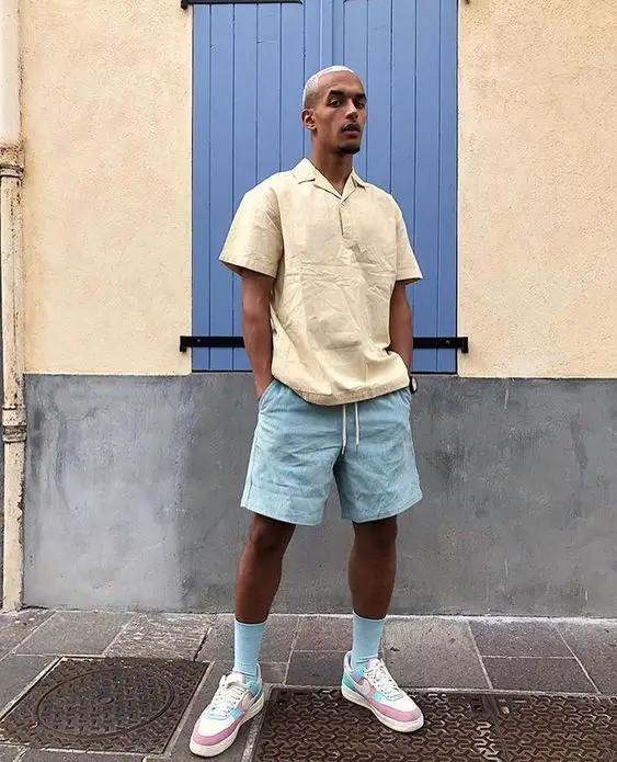 Це вбрання демонструє свіжий погляд на повсякденне літнє вбрання чоловіків у пастельній палітрі кольорів. Кремова сорочка в поєднанні з м’ятно-зеленими шортами створює крутий, розслаблений образ, який ідеально підходить для літніх днів.