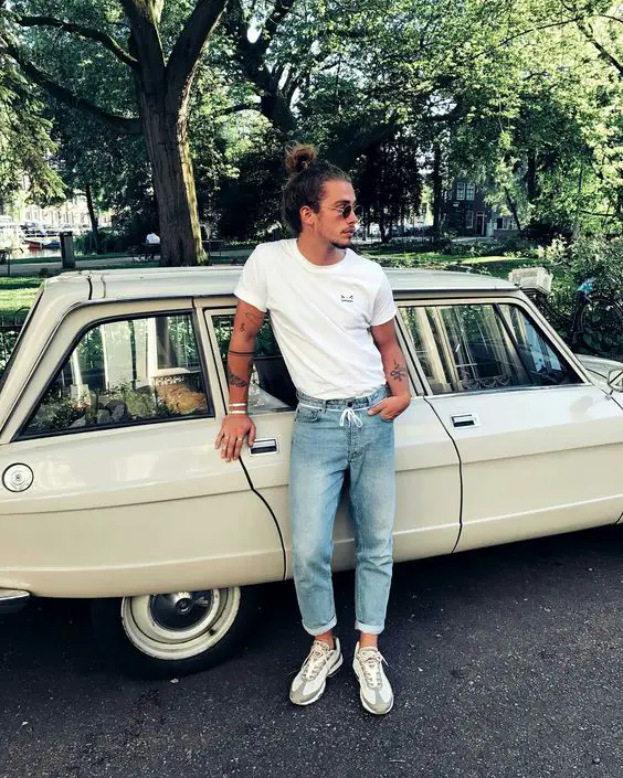 Відчуйте ретро-атмосферу в цьому повсякденному літньому чоловічому вбранні. Біла футболка та світло-блакитні джинси створюють позачасовий повсякденний стиль, який ідеально підходить для літніх днів. Цей одяг підходить різним типам фігури, створюючи розслаблений, але вишуканий вигляд.