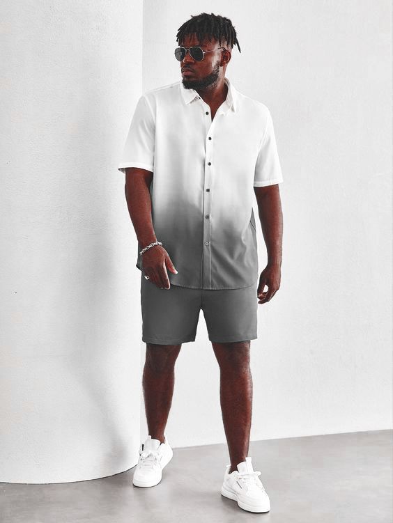 Це вбрання втілює повсякденне літнє чоловіче вбрання у вишуканій простій монохромній кольоровій гамі. Сорочка з градієнтом у поєднанні з шортами в тон створює елегантний мінімалістичний образ, ідеальний для літа.