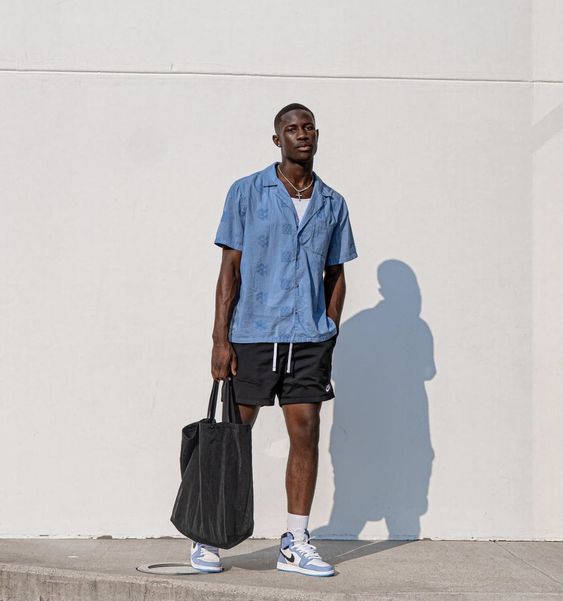 Цей образ є втіленням повсякденного літнього чоловічого одягу. Синя сорочка з малюнком у поєднанні з чорними шортами забезпечує ідеальний баланс між модним і функціональним. Ідеально підходить для чоловіків худорлявої або спортивної статури, цей одяг чудово підходить як для денних, так і для вечірніх заходів, від пляжних вечірок до міських пригод.