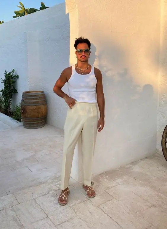 Це вбрання втілює повсякденне літнє чоловіче вбрання з простим, але елегантним поєднанням білої безрукавки та кремових штанів. Ідеальний для чоловіків підтягнутої статури, цей образ ідеально підходить для пляжних прогулянок або звичайних літніх вечорів.