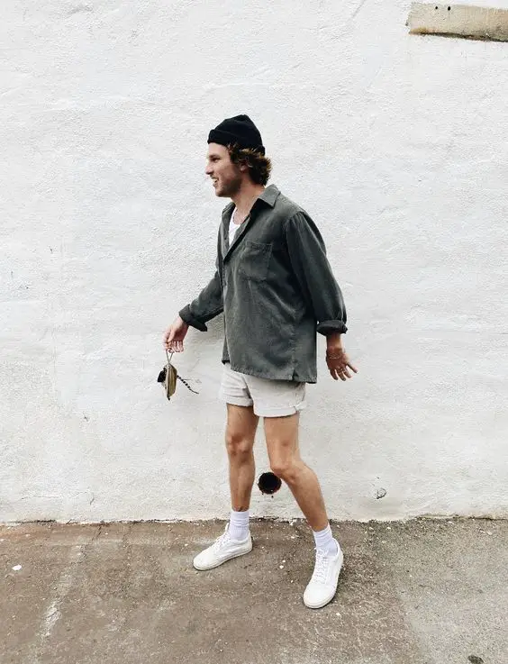 Таке вбрання ідеально втілює повсякденні літні чоловічі стрітстайл. Поєднання оливкової сорочки великого розміру та світло-бежевих шортів створить невимушений, але стильний ансамбль. Цей образ підходить для різних типів фігури, пропонуючи зручну посадку, яка не жертвує стилем. Ідеально підходить для повсякденних прогулянок або спокійних зустрічей з друзями.