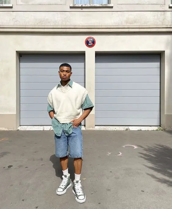 Це вбрання є стильним прикладом повсякденного літнього чоловічого вбрання, вишуканого простого з ошатною родзинкою. Поєднання светра без рукавів, смугастої сорочки та джинсових шортів створює багатошаровий, витончений образ, ідеальний для різноманітних літніх випадків.