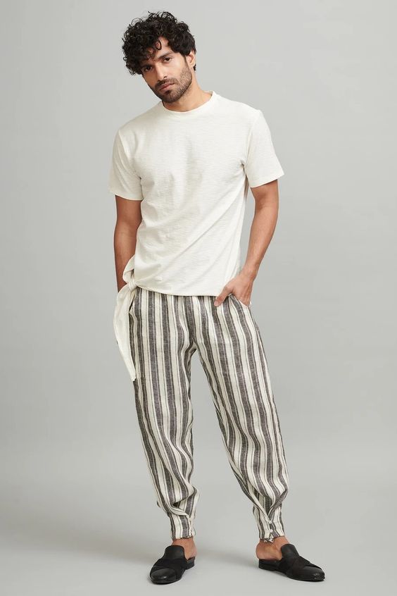 Цей одяг демонструє невимушений, але стильний підхід до повсякденного літнього чоловічого вбрання з акцентом на комфорт. Поєднання простої футболки та штанів у смужку створює невимушений, невимушений образ, ідеальний для літніх днів.