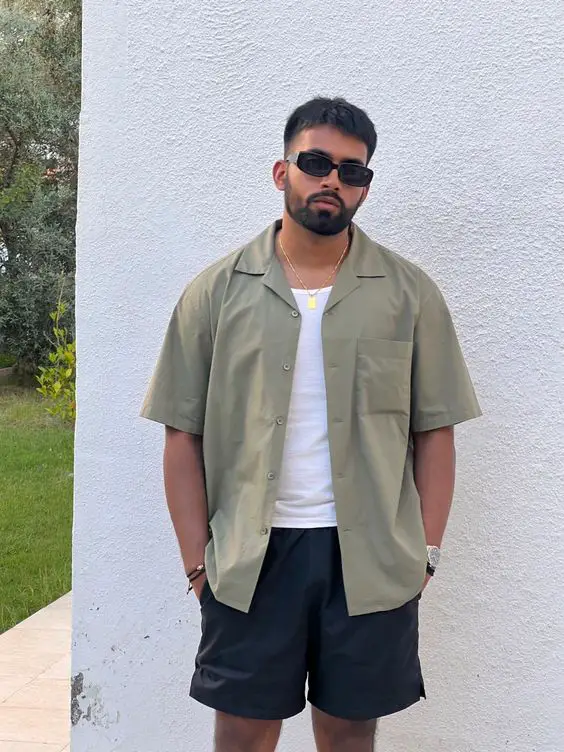 Для тих, хто цінує простоту та елегантність, цей наряд варто спробувати. Оливкова сорочка з коротким рукавом у поєднанні з чорними шортами є основним елементом повсякденного літнього чоловічого вбрання. Цей образ підходить чоловікам середньої та спортивної статури, пропонуючи обтічний силует, який ідеально підходить для різних випадків, від повсякденних зустрічей до напівофіційних заходів.