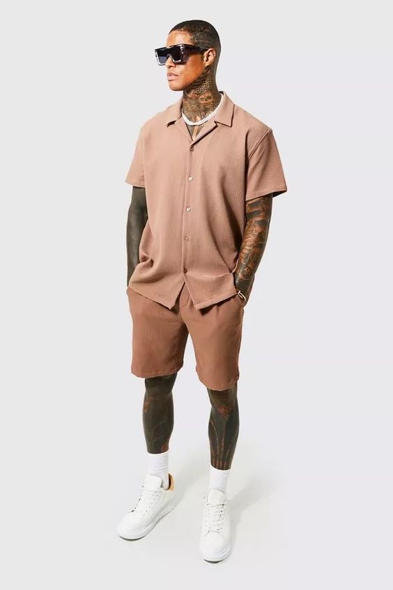Цей одяг демонструє сучасний погляд на повсякденне літнє чоловіче корейське вбрання. Коричневий комплект в тон одночасно стильний і зручний, що робить його ідеальним для літніх прогулянок. Цей образ підходить для чоловіків будь-якої статури, пропонуючи сучасну інтерпретацію класичного літнього вбрання. Ідеально підходить для вуличного стилю, пляжних поїздок або випадкових ділових зустрічей.
