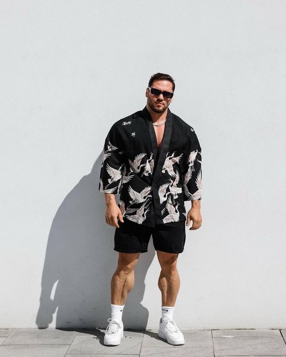 Для тих, хто хоче виділитися, це вбрання є ідеальним прикладом повсякденного літнього чоловічого стріт стилю. Чорний жакет у стилі кімоно зі сміливим принтом у поєднанні з чорними шортами створює вражаючий різкий образ. Ідеальний для чоловіків спортивної статури, цей одяг ідеально підійде для яскравих речей під час світських заходів або подорожей містом.
