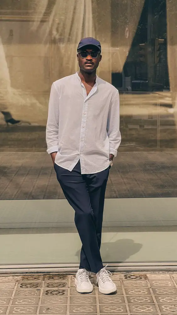 У цьому вбранні поєднується міська витонченість із повсякденним комфортом. Біла сорочка на ґудзиках у поєднанні з темно-синіми брюками створює витончений, але невимушений образ, ідеальний для різних літніх випадків. Ідеальний для чоловіків худорлявої або спортивної статури, цей одяг чудово підходить як для повсякденних, так і для напівофіційних заходів.