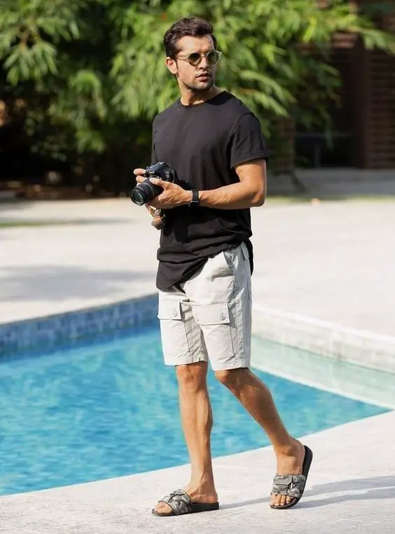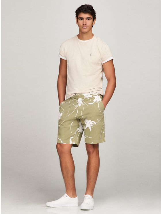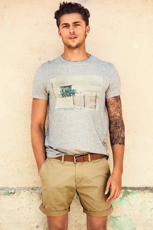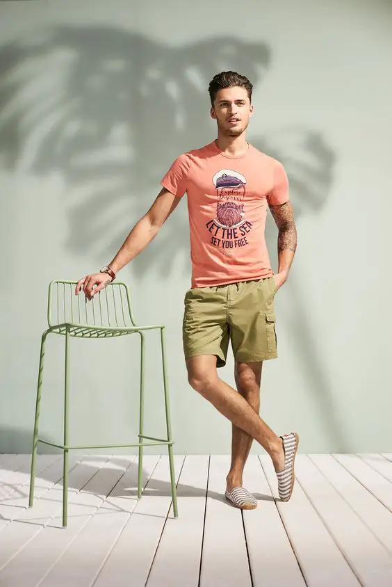 Тут модель одягнена у футболку з графічним малюнком у поєднанні з шортами кольору хакі. Поєднання класичне та легке, ідеальне для невимушеного літнього стилю.