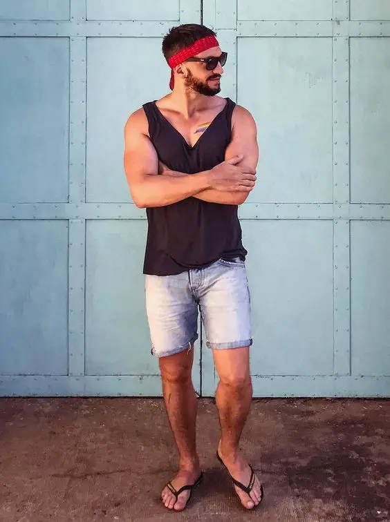 У цьому вбранні темна майка без рукавів у поєднанні зі світлими джинсовими шортами. Образ доповнює червона пов’язка на голову та шльопанці, створюючи невимушену, але сміливу атмосферу, ідеальну для літа.
