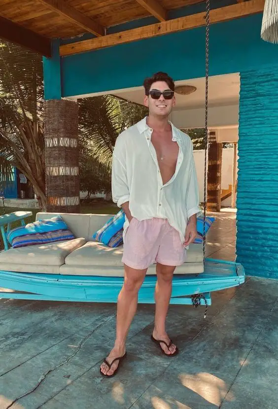 У цьому образі модель одягає білу оверсайз-сорочку на ґудзиках і рожеві шорти. Комбінація легка та свіжа, що робить її ідеальною для дня на пляжі чи повсякденної літньої прогулянки.