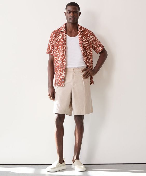 У цьому вбранні біла безрукавка поєднується з бежевими шортами та сорочкою з короткими рукавами з малюнком. Вишуканий і стильний вигляд ідеально підходить для різноманітних літніх заходів.