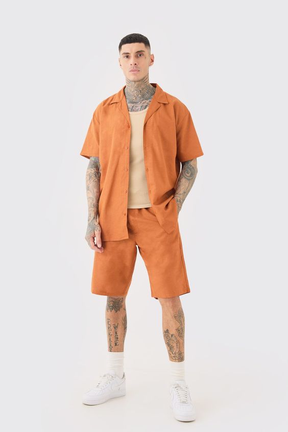 Цей одяг складається з помаранчевої сорочки з короткими рукавами та шортів у тон, що створює сміливий монохромний образ. Ця модель доповнює образ бежевою безрукавкою та білими кросівками, залишаючись привабливою та привабливою.