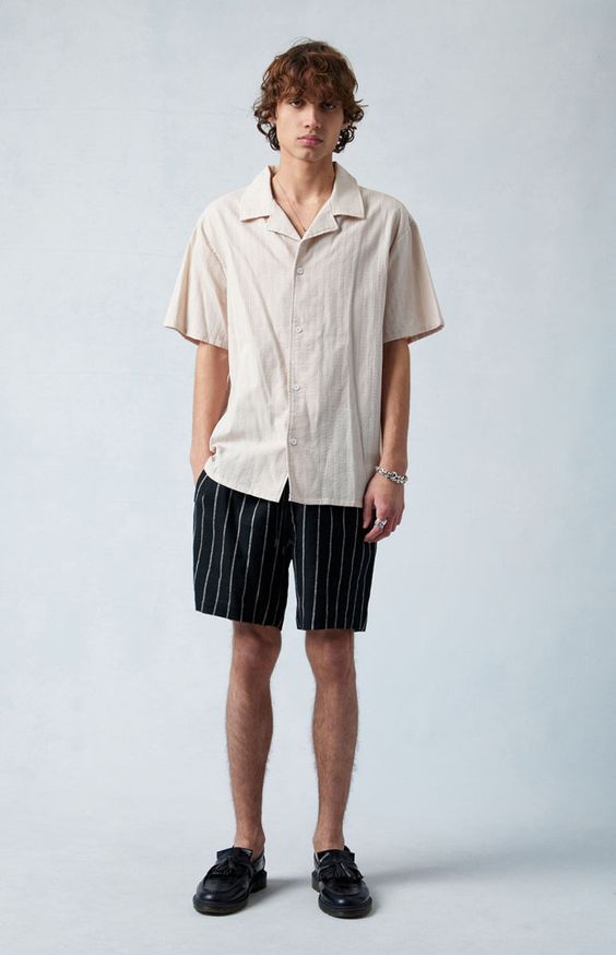 У цьому образі модель поєднує вільну бежеву сорочку з короткими рукавами та чорні шорти в тонку смужку. Вбрання доповнено чорними лоферами, які створюють невимушену, але водночас шикарну атмосферу.