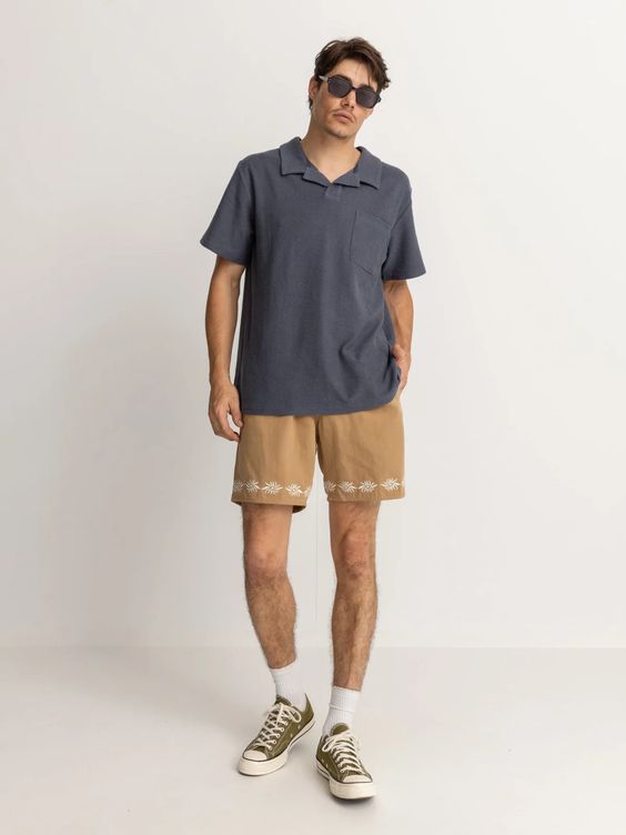 Цей одяг демонструє блакитну сорочку поло в поєднанні зі світло-коричневими шортами з тонким квітковим принтом уздовж подолу. Образ доповнюють зелені кросівки, які створюють комфортну та прохолодну літню атмосферу.