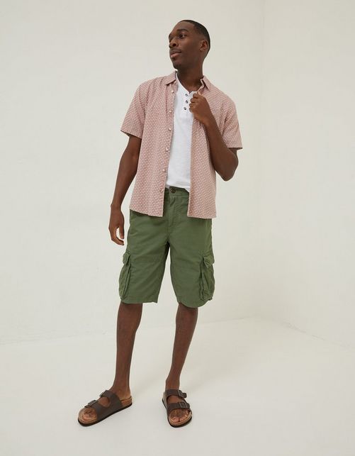 Цей одяг включає білу сорочку на пуговицах у поєднанні з зеленими шортами карго та сорочкою з короткими рукавами з малюнком. Спокійний і функціональний образ ідеально підходить для повсякденного літнього дня.