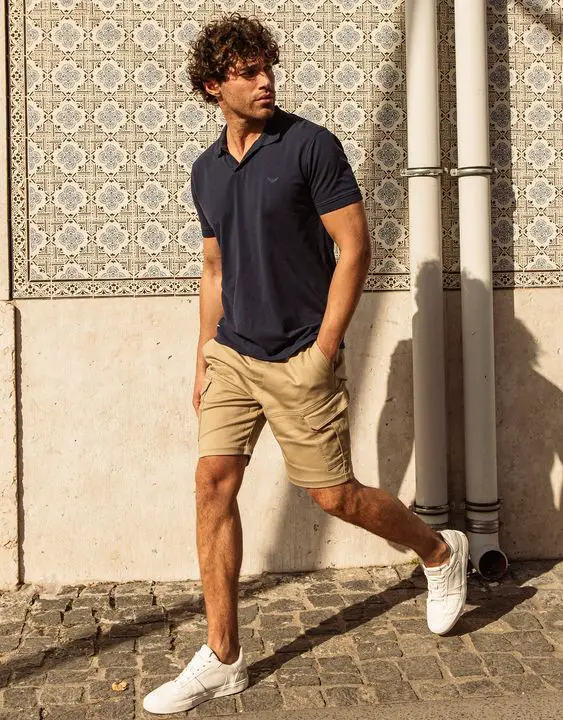 У цьому вбранні темно-синя сорочка-поло поєднується з шортами карго кольору хакі. Образ доповнюють білі кросівки, створюючи стильний повсякденний ансамбль, ідеальний для літа.