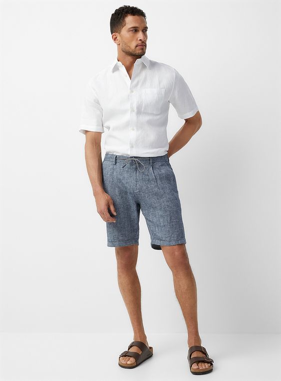У цьому образі модель носить білу лляну сорочку в поєднанні з сірими лляними шортами. Одяг легкий і легкий, ідеально підходить для прохолоди в спекотні літні дні.
